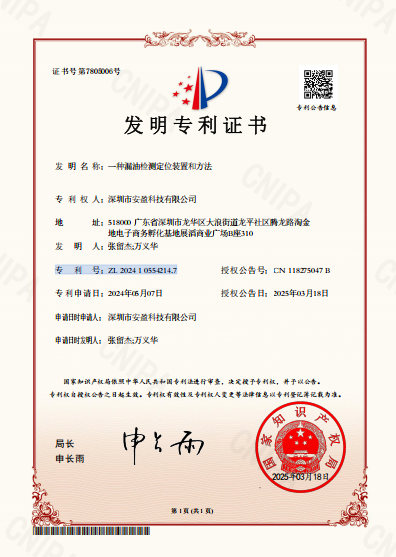 3月18日消息,深圳市安盈科技有限公司收到由中華人民共和國(guó)國(guó)家知識(shí)產(chǎn)權(quán)局頒發(fā)的一項(xiàng)《發(fā)明專(zhuān)利證書(shū)》,安盈科技自主研發(fā)的漏油監(jiān)測(cè)系統(tǒng)——“一種漏油檢測(cè)定位裝置和方法”榮獲國(guó)家發(fā)明專(zhuān)利,專(zhuān)利號(hào):ZL 2024 1 0554214.7。這一成果標(biāo)志著安盈科技在工業(yè)安全監(jiān)測(cè)技術(shù)領(lǐng)域的領(lǐng)先地位,也為行業(yè)漏液監(jiān)測(cè)提供了創(chuàng)新解決方案。...