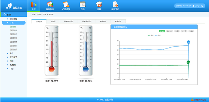 管理人員只要登錄機(jī)房動(dòng)環(huán)監(jiān)控系統(tǒng)云平臺(tái),就可以查看所有監(jiān)控設(shè)備過去在運(yùn)行過程中的所有數(shù)據(jù),長安穩(wěn)盈動(dòng)環(huán)監(jiān)控系統(tǒng)可以查看各設(shè)備參數(shù)的4小時(shí)、24小時(shí)、1周、1月、1年曲線圖,并導(dǎo)出數(shù)據(jù)統(tǒng)計(jì)分析報(bào)表。