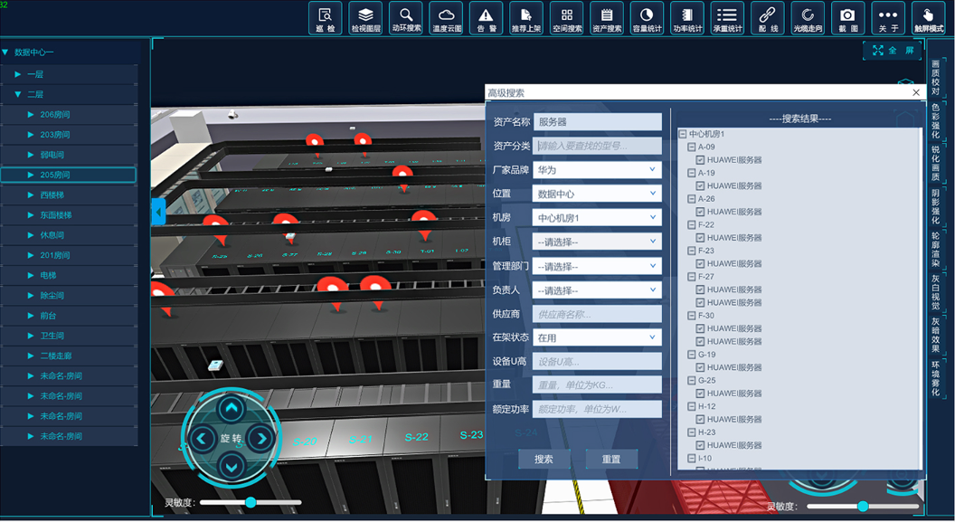 1)資產(chǎn)可視化管理:3D場(chǎng)景分級(jí)瀏覽、快速模糊查詢、設(shè)備上下架可視化、全設(shè)備虛擬仿真、資產(chǎn)信息查看、資產(chǎn)信息編輯、高級(jí)附和搜索等。